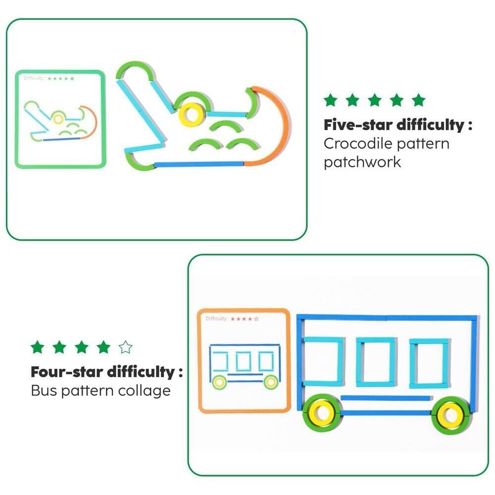 ⏳🎨 Fängslande Lekstund: Med 20 dubbelsidiga kort (40 mönster) kan barn börja med enkla designer och gå vidare till mer avancerade. Oavsett om de följer korten eller skapar egna mönster, får barnen timmar av interaktiv lek, där de lär sig om bokstäver och mönster på ett roligt sätt.